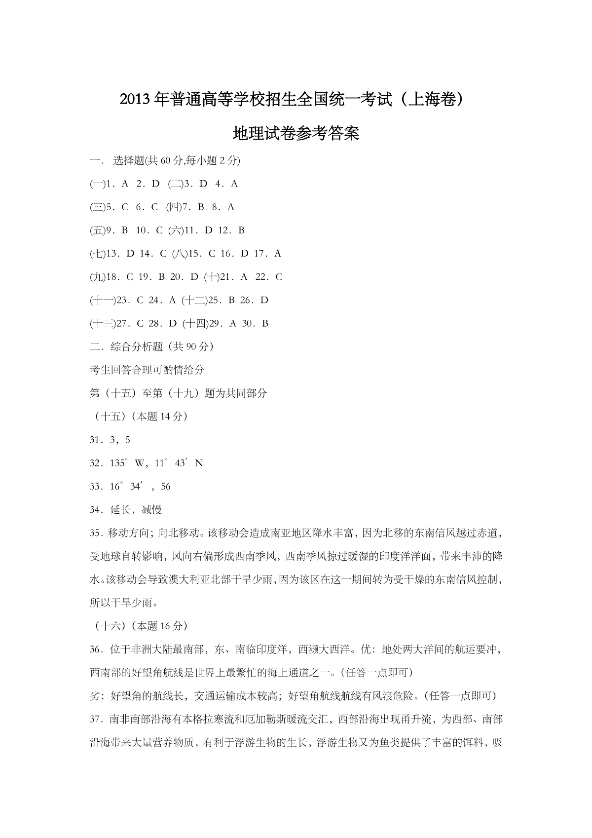 下载2013年上海市高考地理试题及答案PDF格式或doc