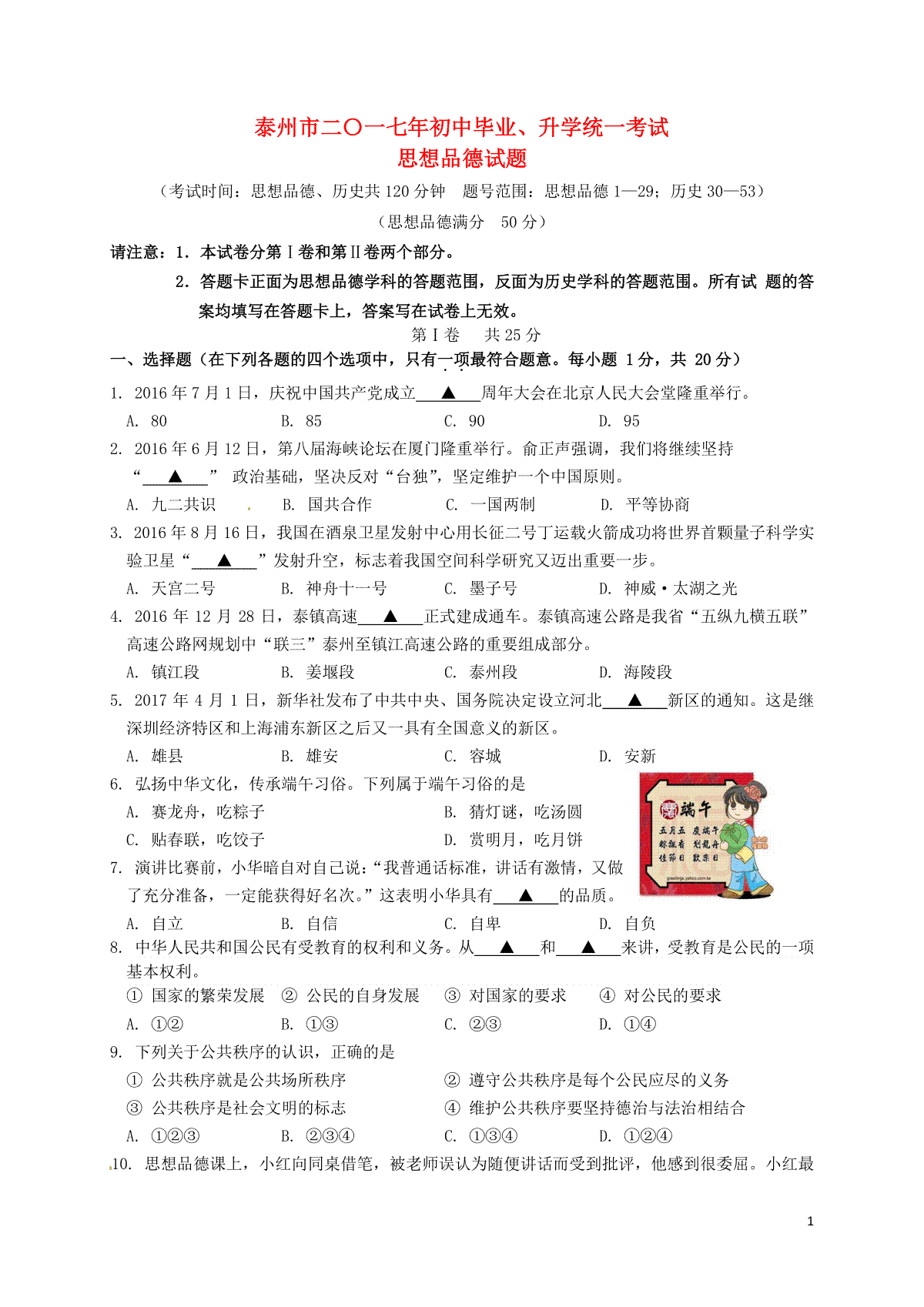 一、江苏省泰州市2017年中考思想品德真题试题(含答案)