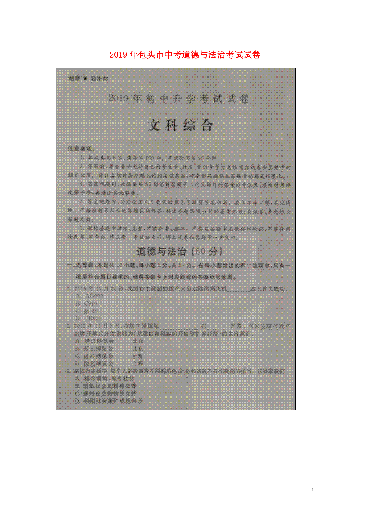 内蒙古包头市2019年中考道德与法治真题试题(扫描版)于近期开考,本次考试对考生对知识的掌握参考价值大,为了方便大家复习掌握错题!小编在下文为大家准备了内蒙古包头市2019年中考道德与法治真题试题(扫描版)试卷及答案解析详情,仅供考生参考。