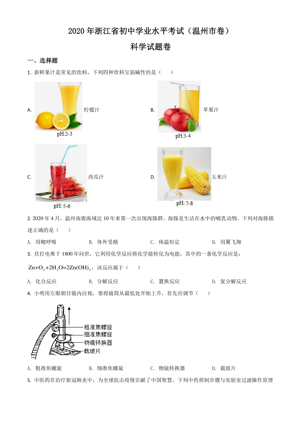 一、精品解析:浙江省温州市2020年中考科学试题(原卷版)