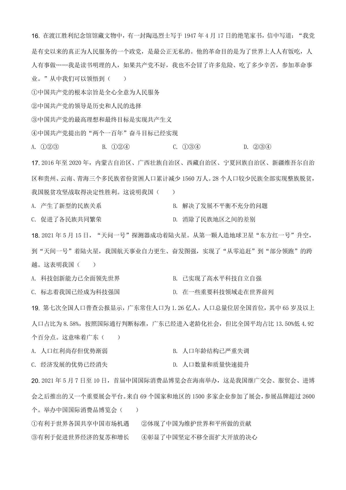 一、精品解析:2021年广东省中考道德与法治真题(原卷版)