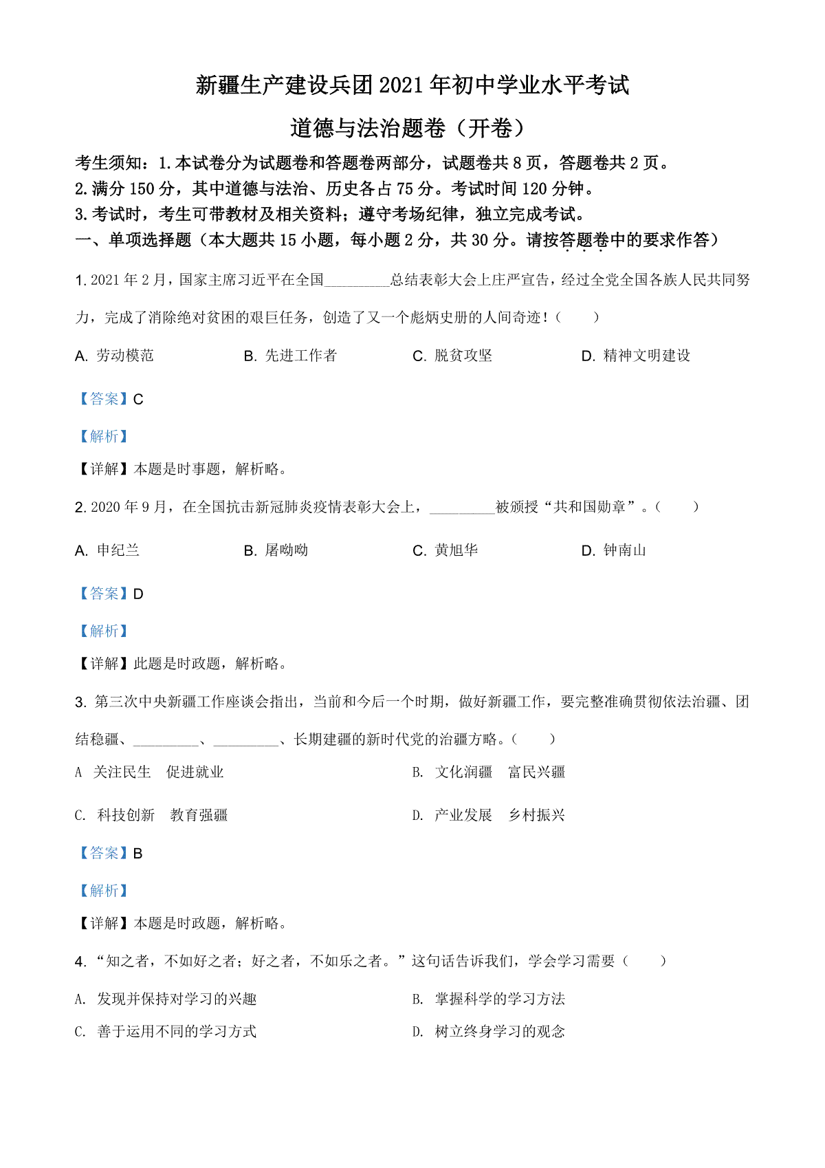 一、精品解析:2021年新疆维吾尔自治区、生产建设兵团中考道德与法治真题(解析版)