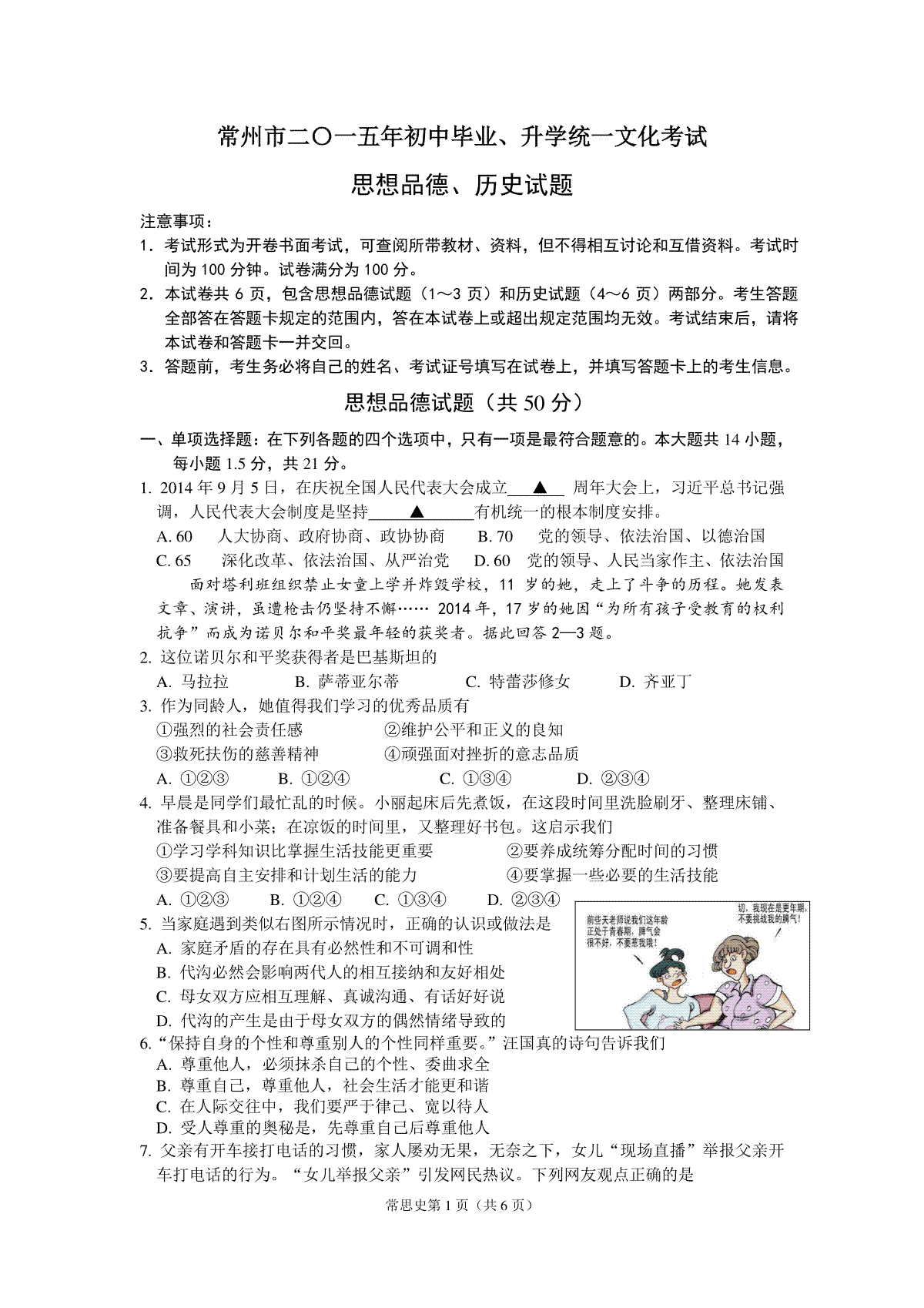 下载2015常州市中考思想品德试卷及答案PDF格式或doc