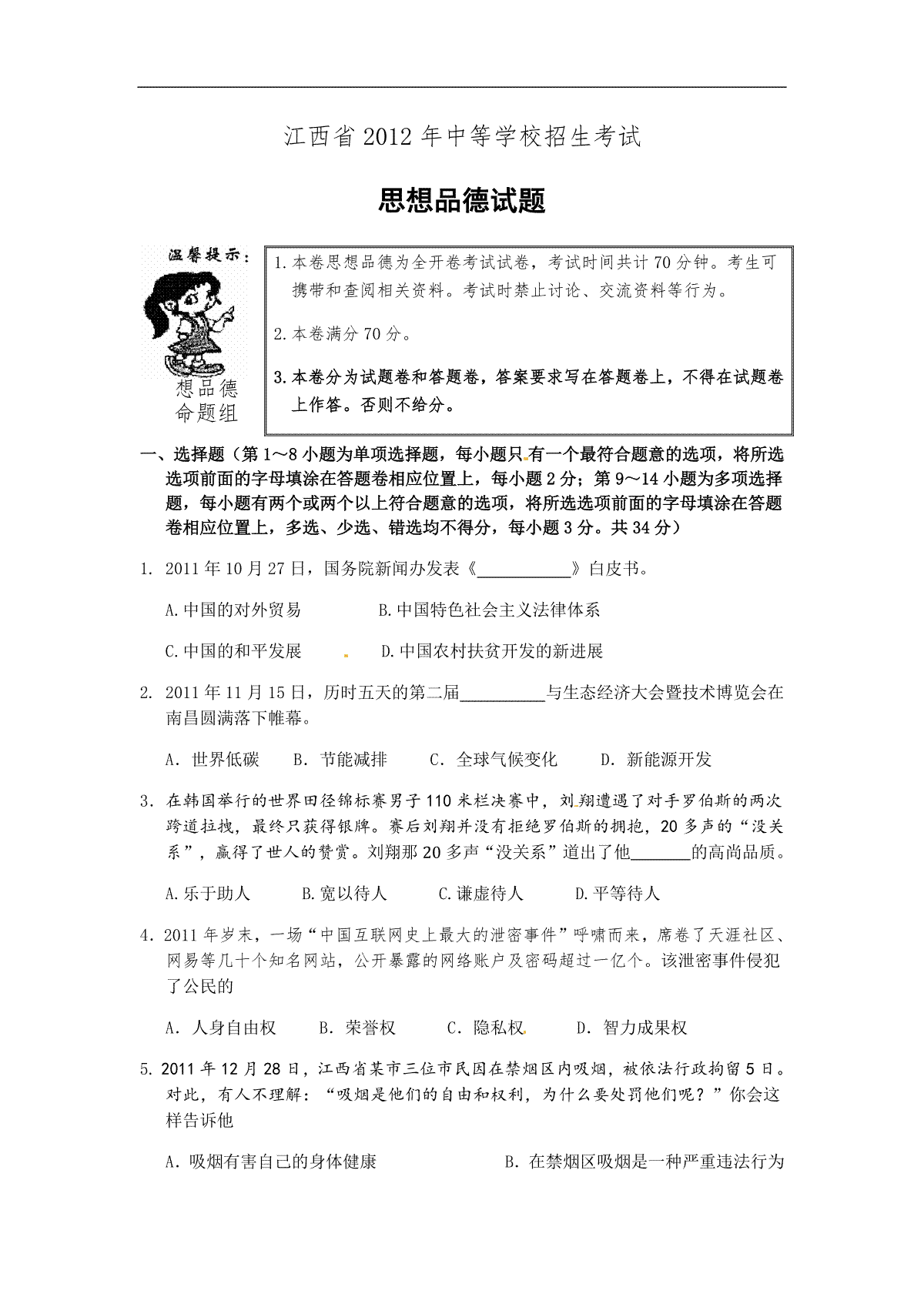如果你想下载2012年江西省中考道德与法治试卷及答案DOC或PDF版,请点击本文末链接!