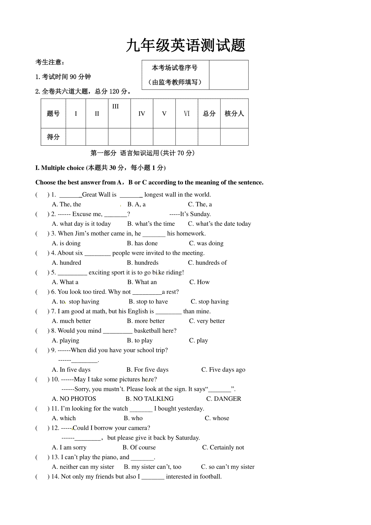 一、09.黑龙江省绥棱县2014届九年级上学期期末考试英语试题(附答案)