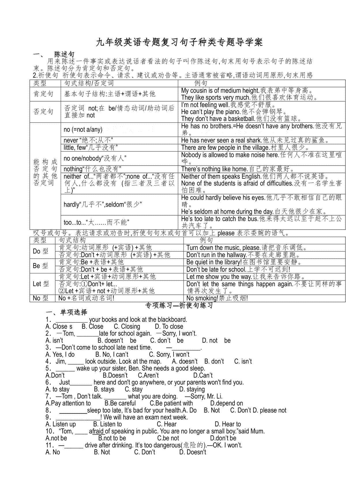 人教版九年级英语专题复习导学案:句子种类专题于近期开考,本次考试对考生对知识的掌握参考价值大,为了方便大家复习掌握错题!小编在下文为大家准备了人教版九年级英语专题复习导学案:句子种类专题试卷及答案解析详情,仅供考生参考。