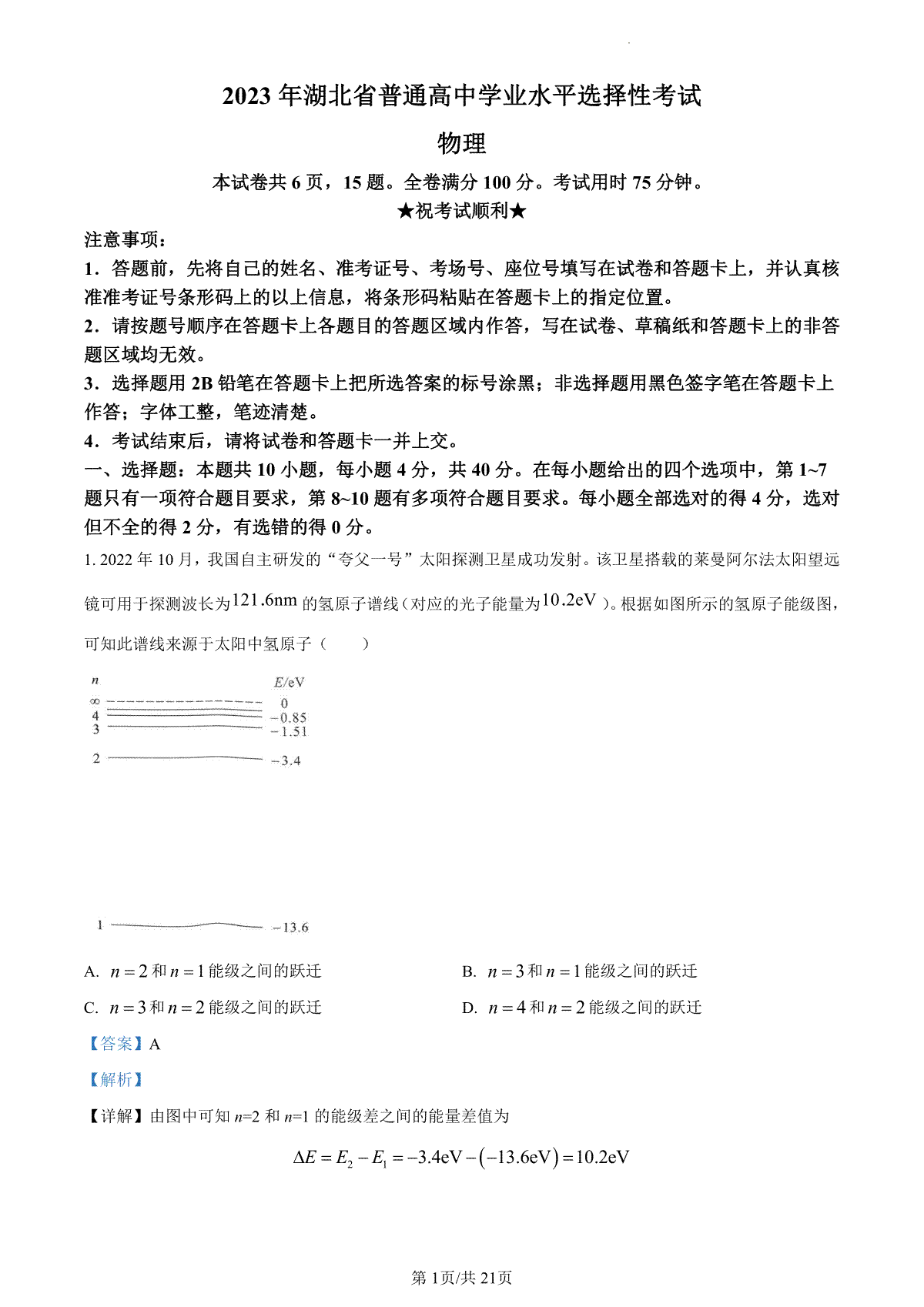 下载2023年高考湖北卷物理真题(答案)PDF格式或doc