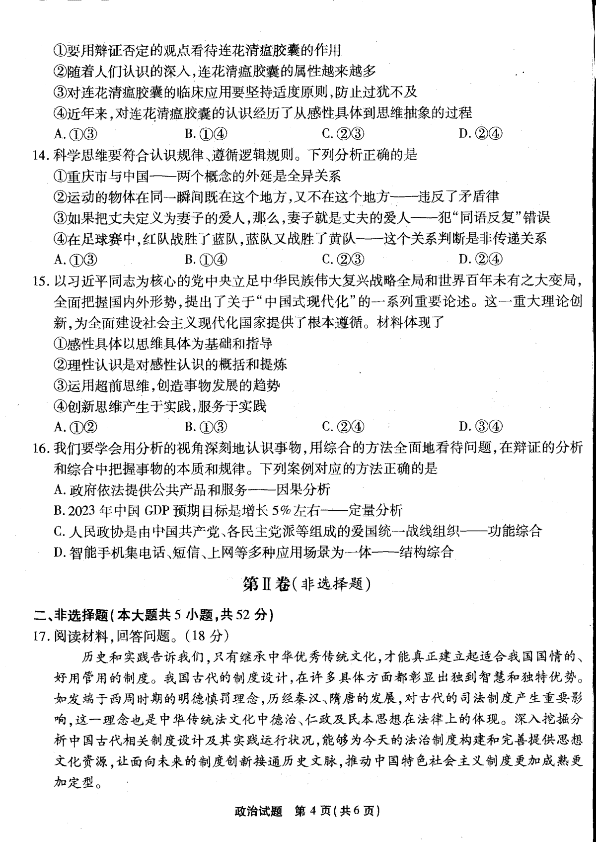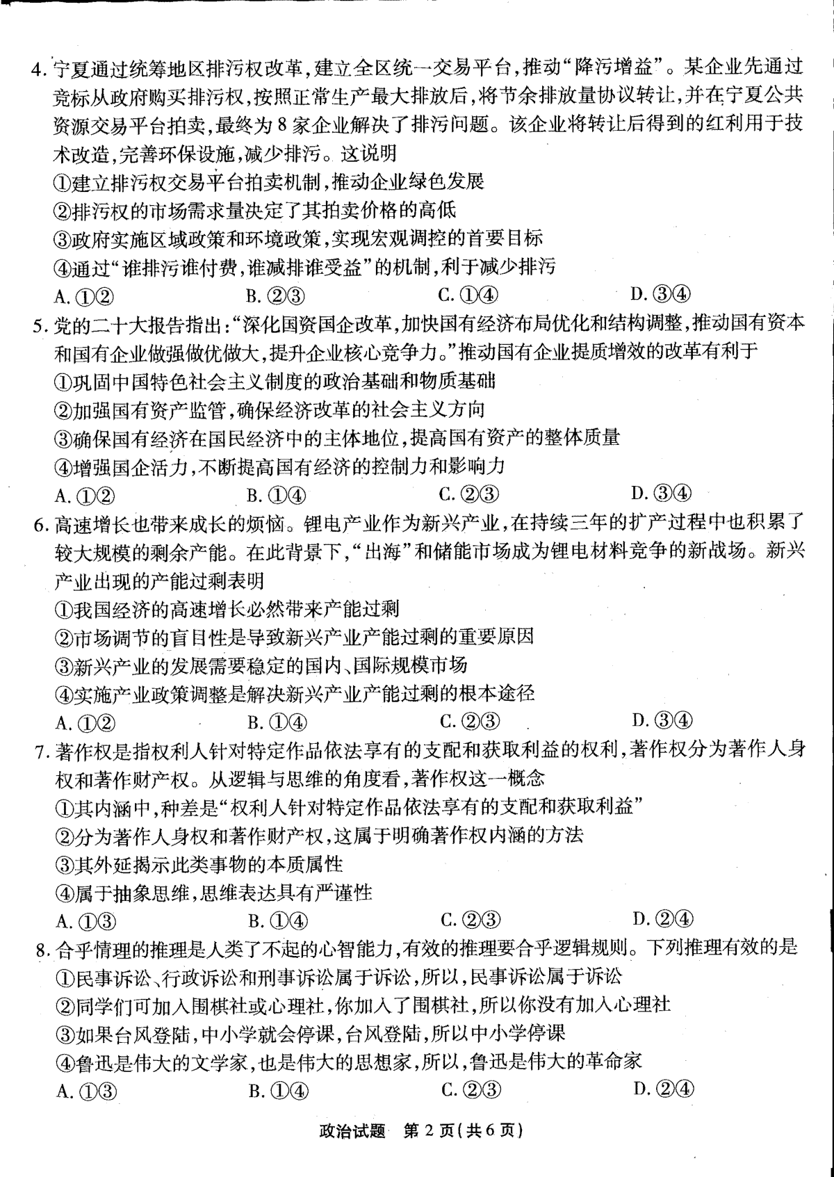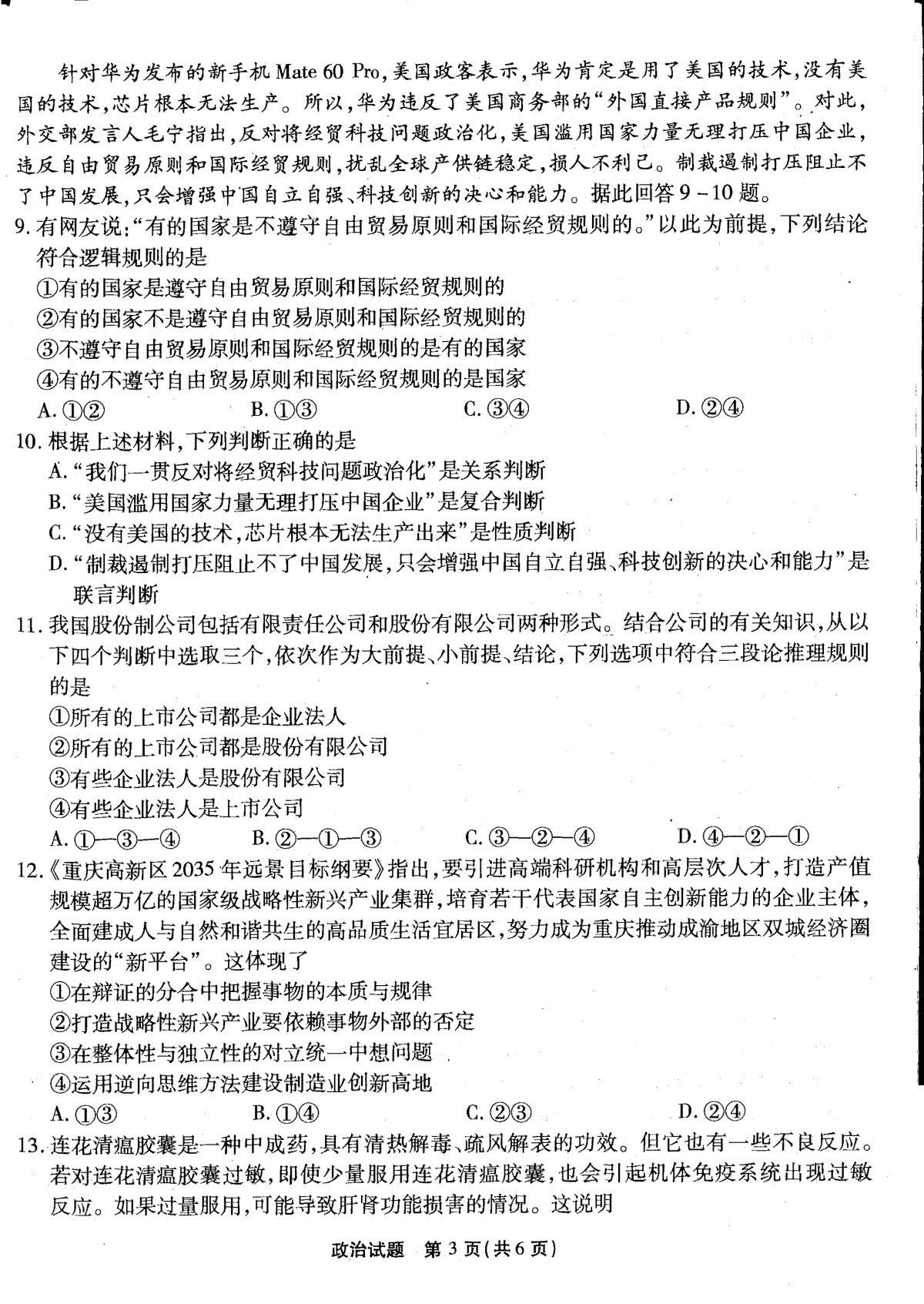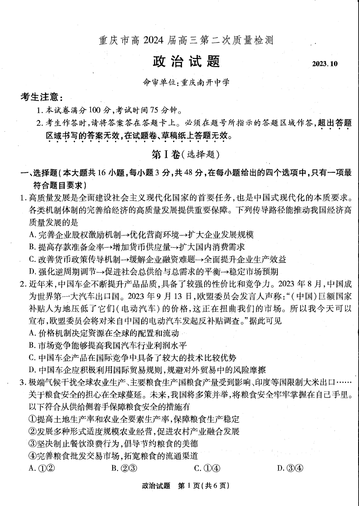一、重庆市南开中学校2023-2024学年高三上学期第二次质量检测联考 政治