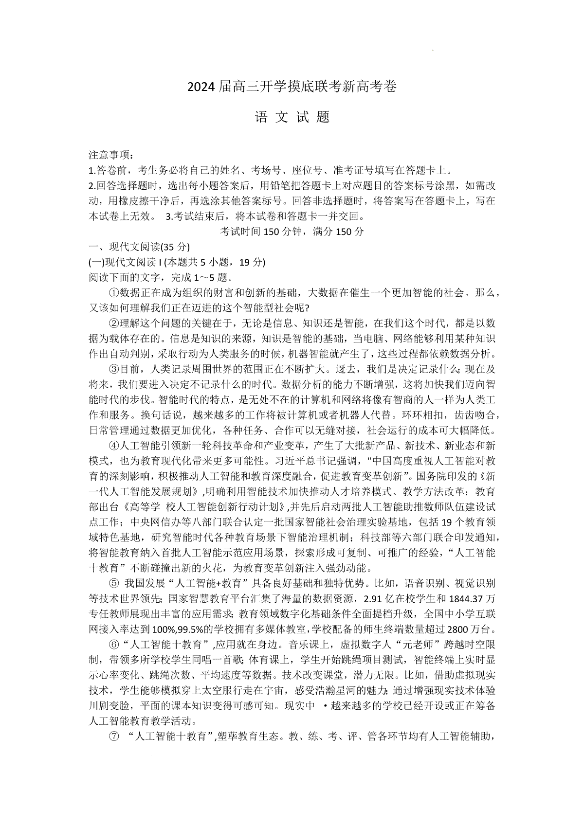 一、2024届百师联盟高三上学期开学摸底联考新高考(河北卷)语文