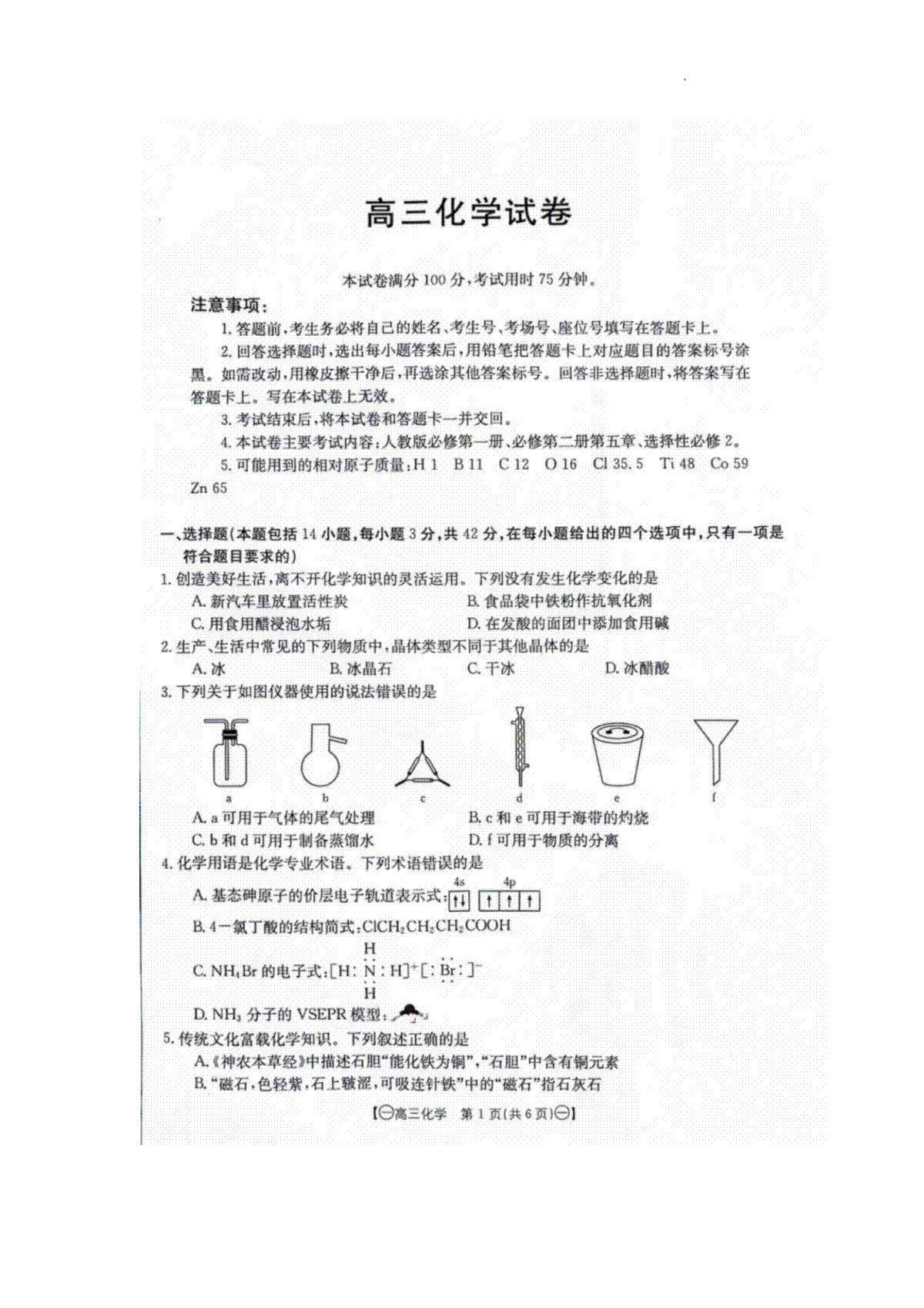 一、江西省部分高中学校2023-2024学年高三10月联考化学试题