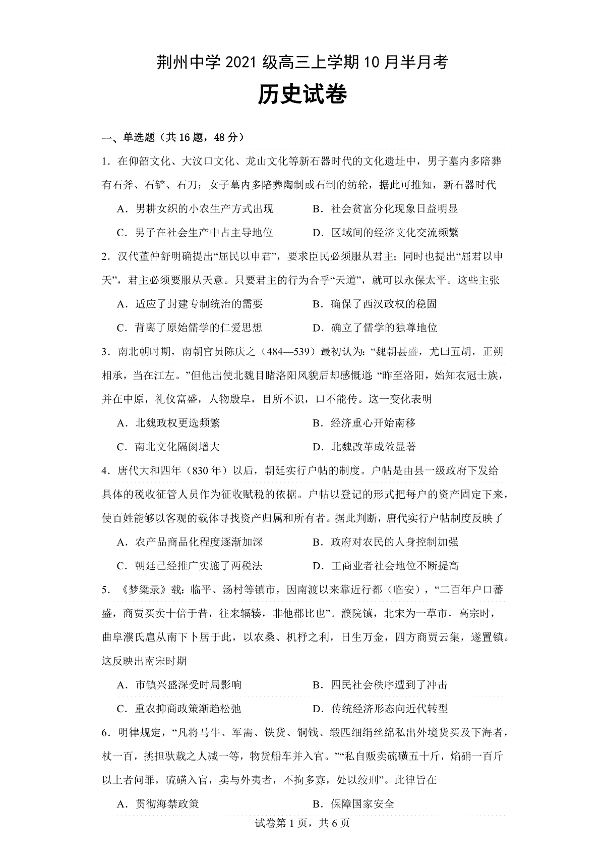 一、湖北省荆州中学2023-2024学年高三上学期10月半月考 历史