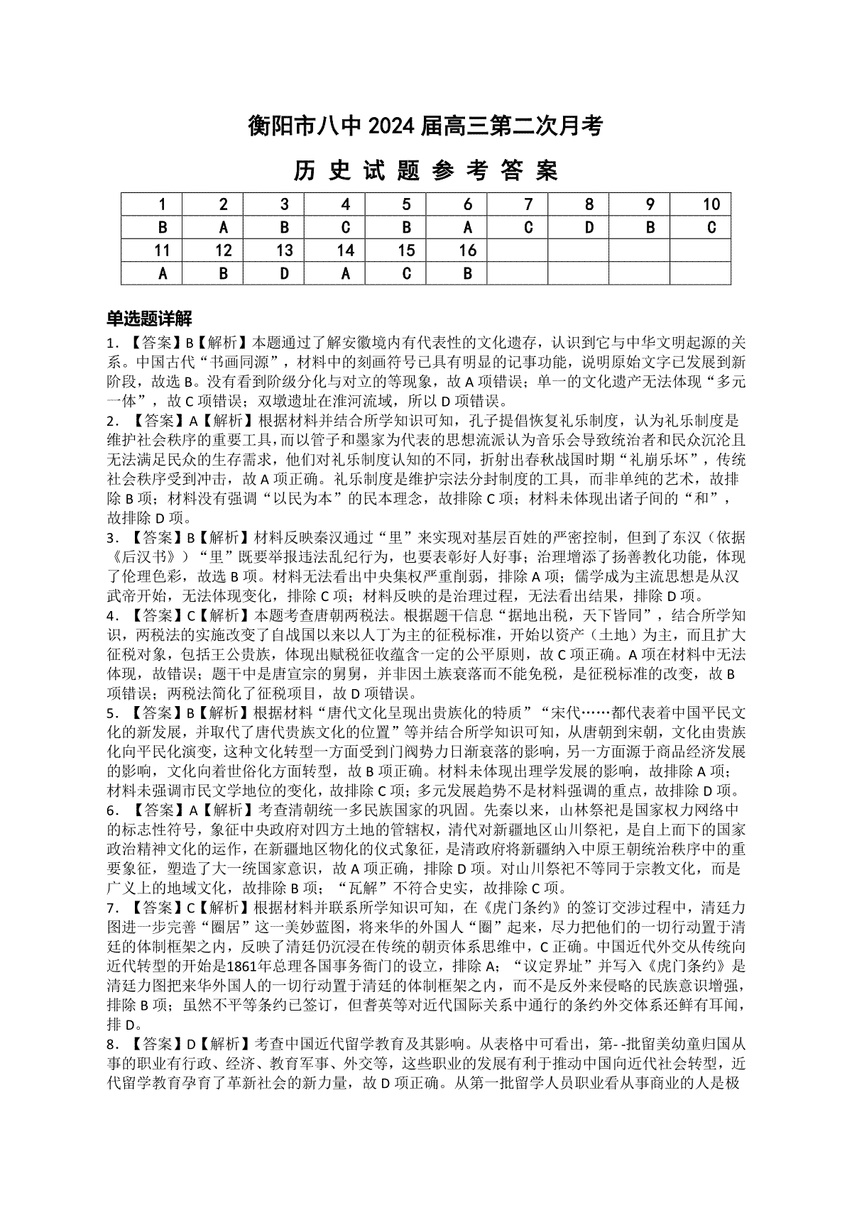 一、湖南省衡阳市第八中学2024届高三上学期10月第二次月考历史答案(1)