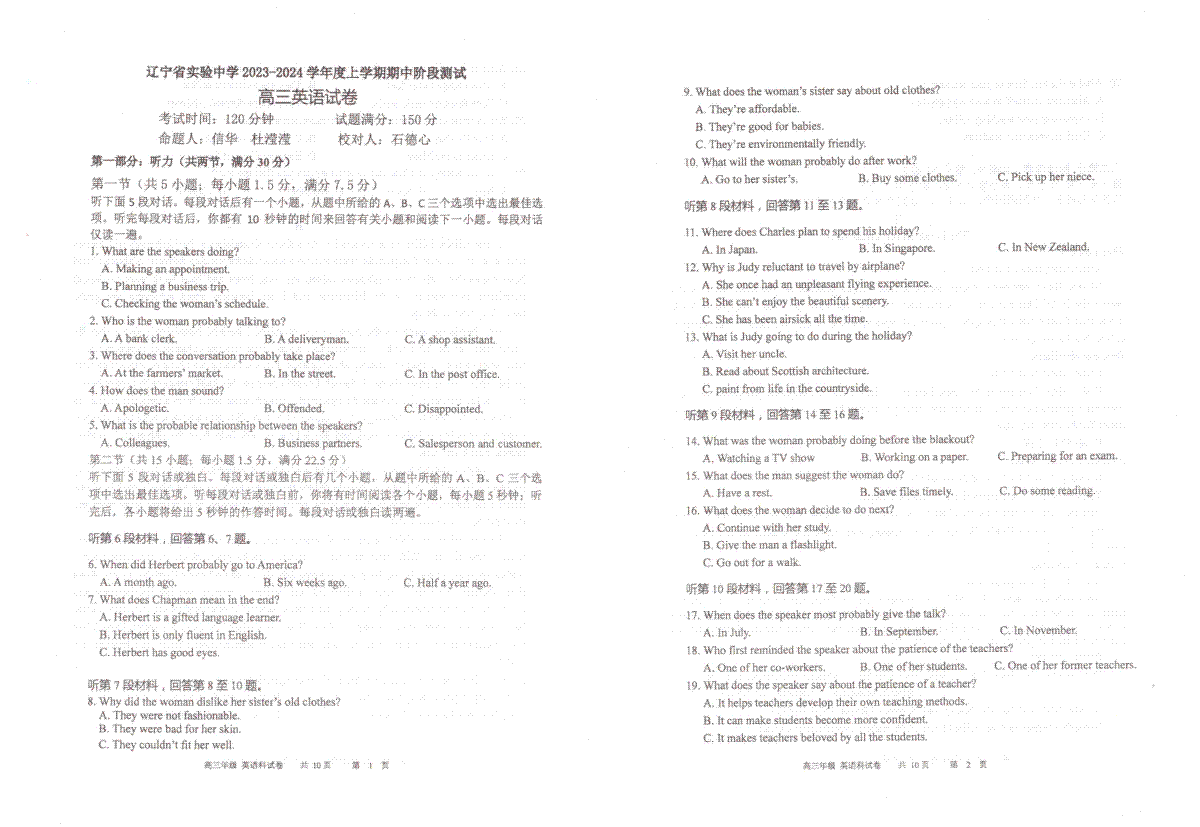 如果你想下载辽宁省实验中学2023-2024学年高三上学期期中考试英语试题DOC或PDF版,请点击本文末链接!