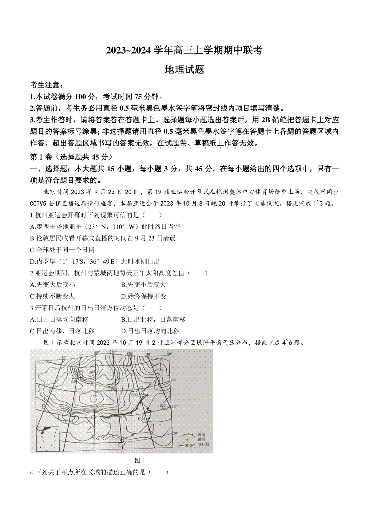 一、安徽省亳州市蒙城县2023—2024学年高三上学期期中联考 地理