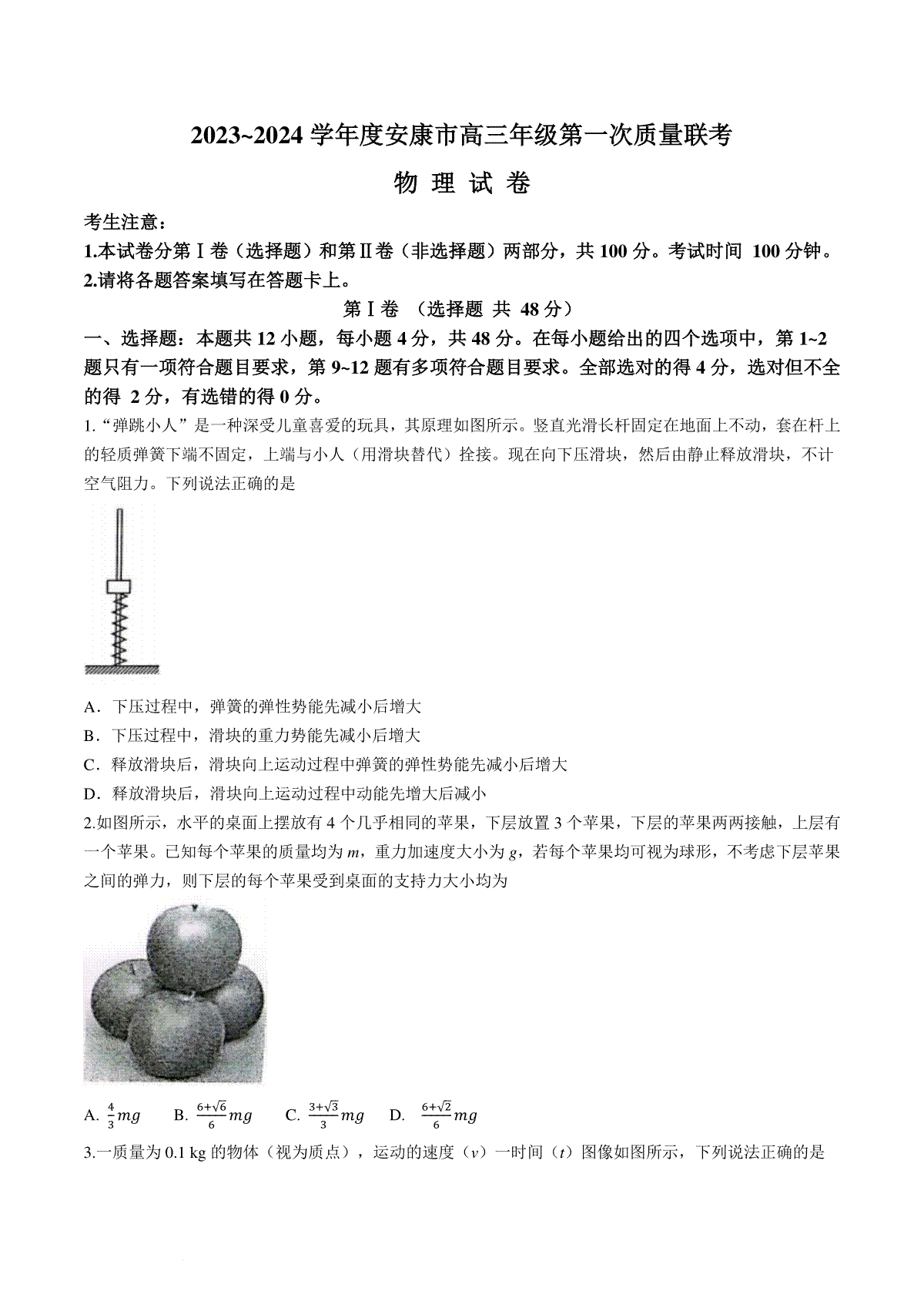 一、2023-2024学年度安康市高三年级第一次质量联考物理试题