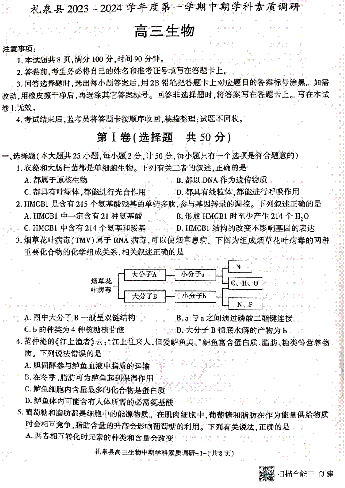 一、咸阳市礼泉县2023-2024学年度第一学期中期学科素质调研 生物