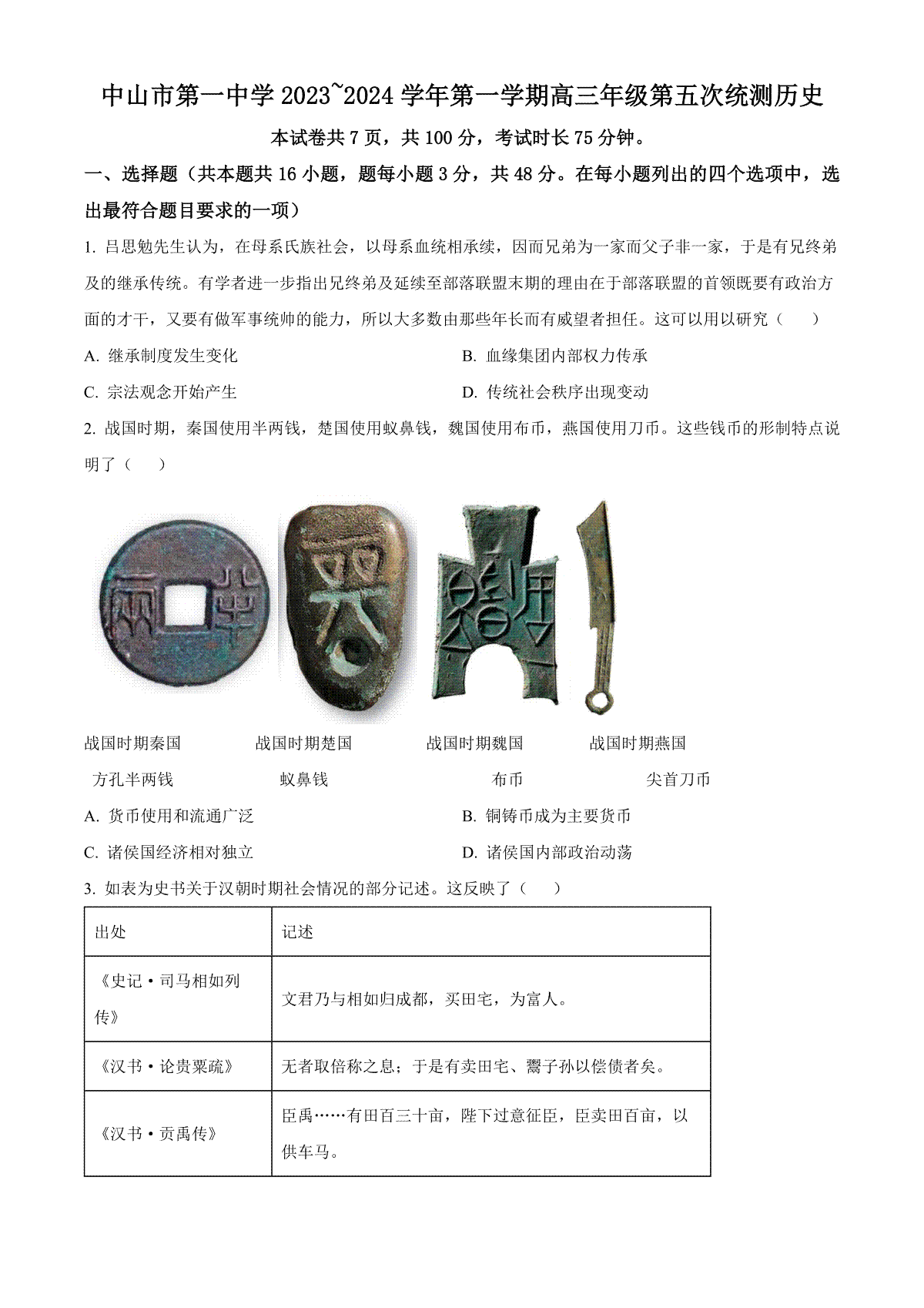 一、历史-广东省中山市第一中学2023-2024学年高三上学期第五次统测试题