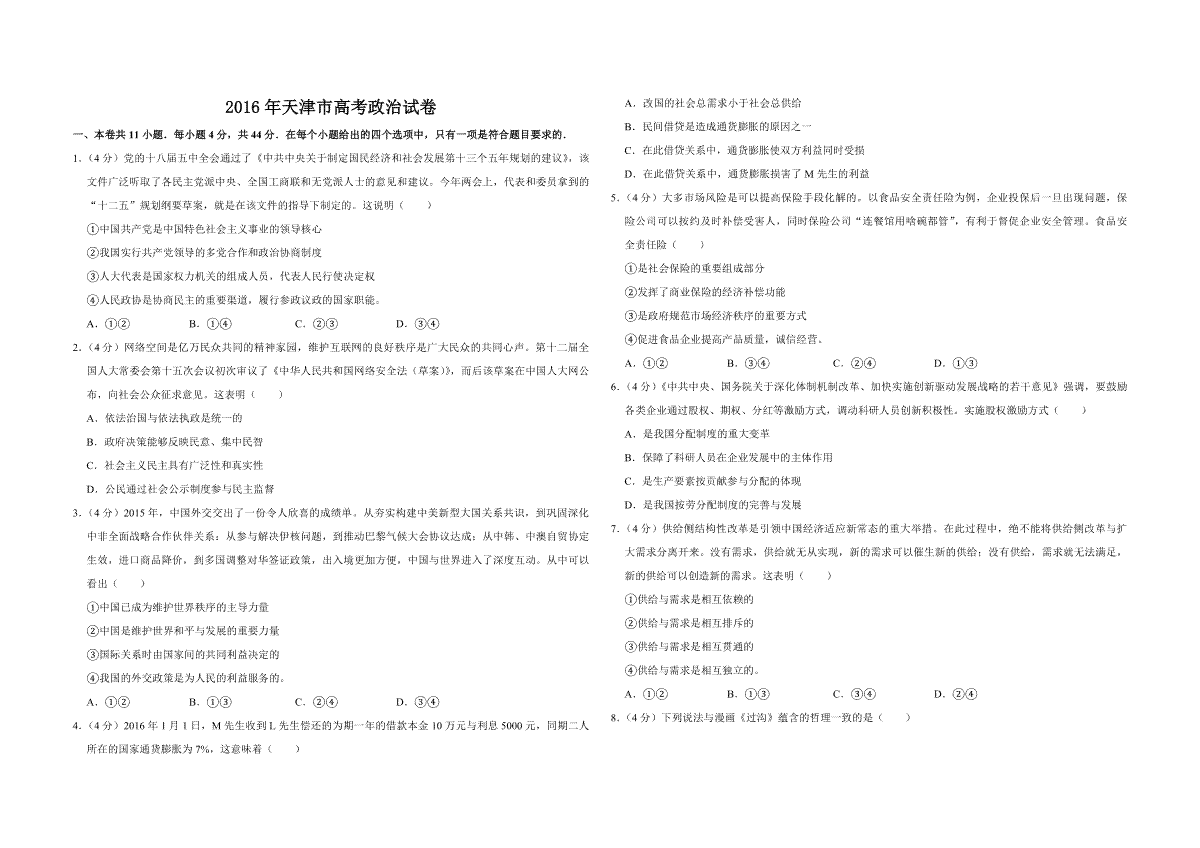 下载2016年天津市高考政治试卷 PDF格式或doc