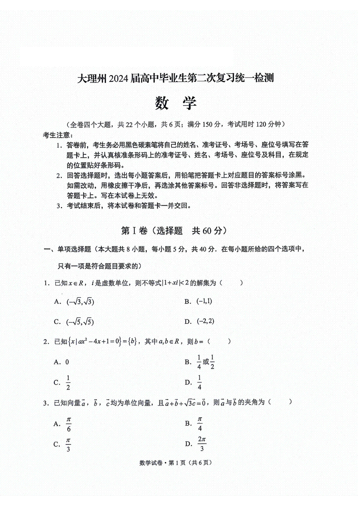一、大理州2024届高中毕业生第二次复习统一检测—数学试卷