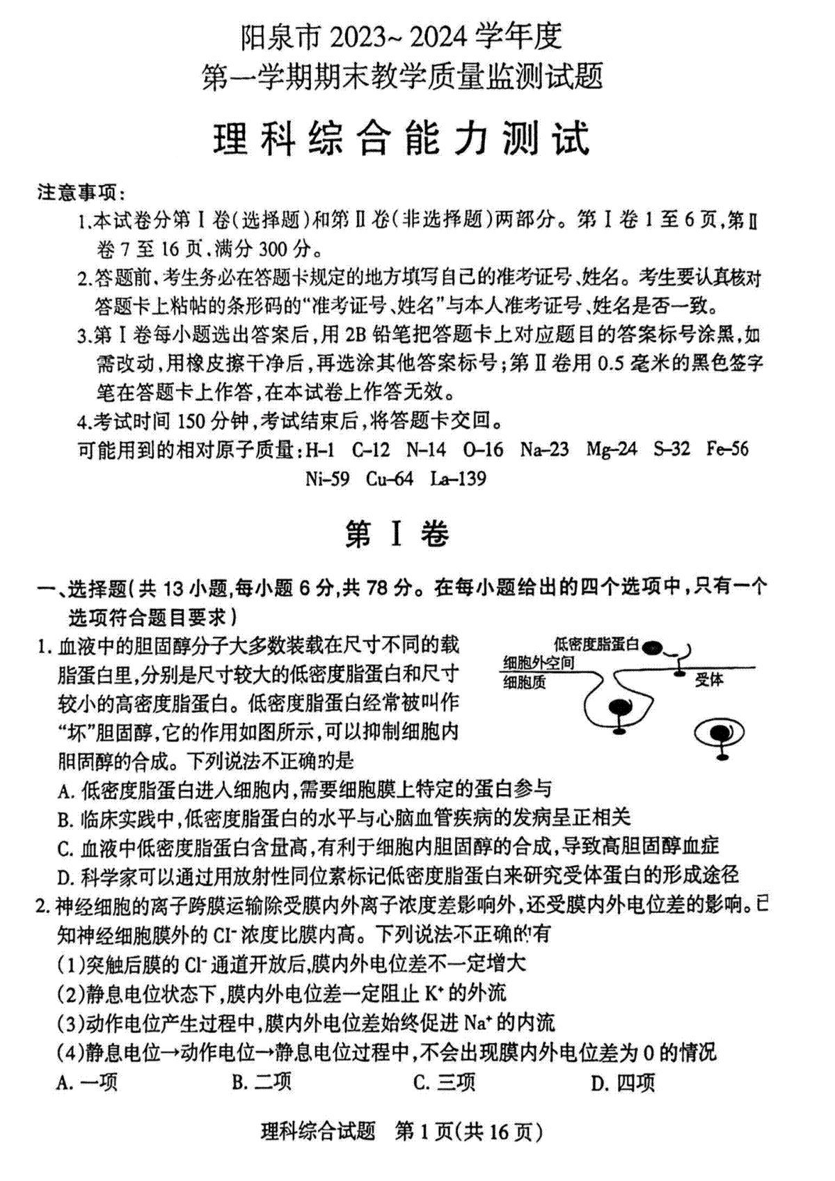 一、【理综试卷】阳泉市2023~2024学年度第一学期期末教学质量监测试题