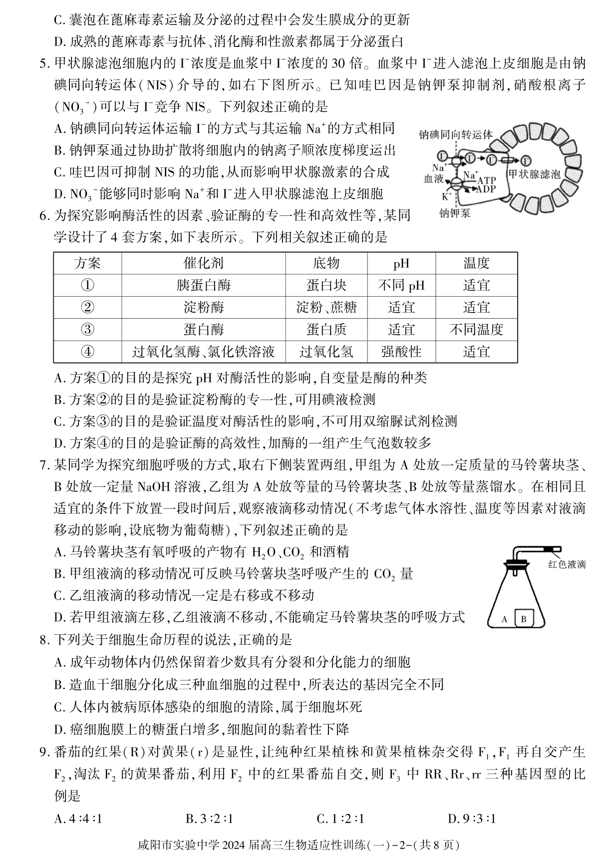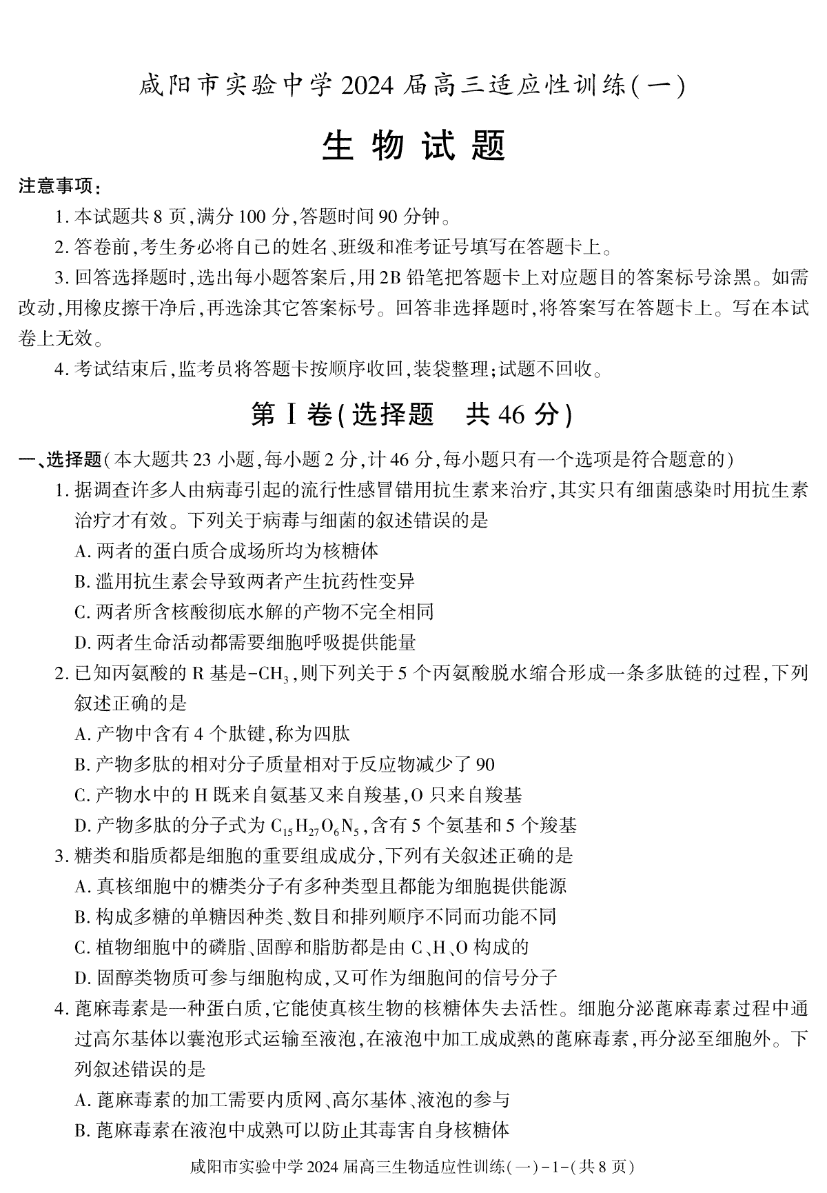 一、陕西省咸阳市实验中学2022-2023学年高三下学期适应训练(一)生物试题