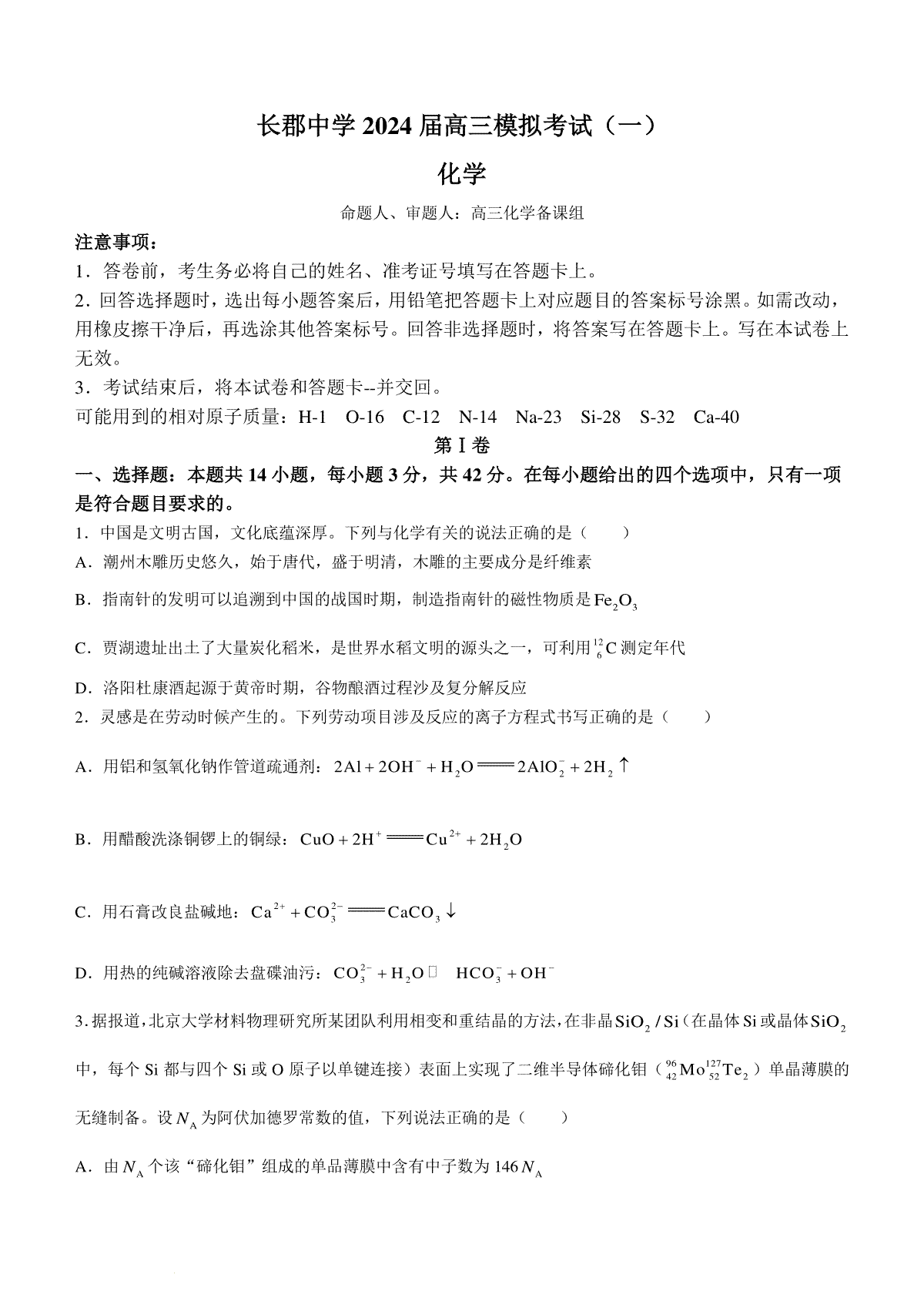 一、2024届湖南省长沙市长郡中学高三一模化学试题