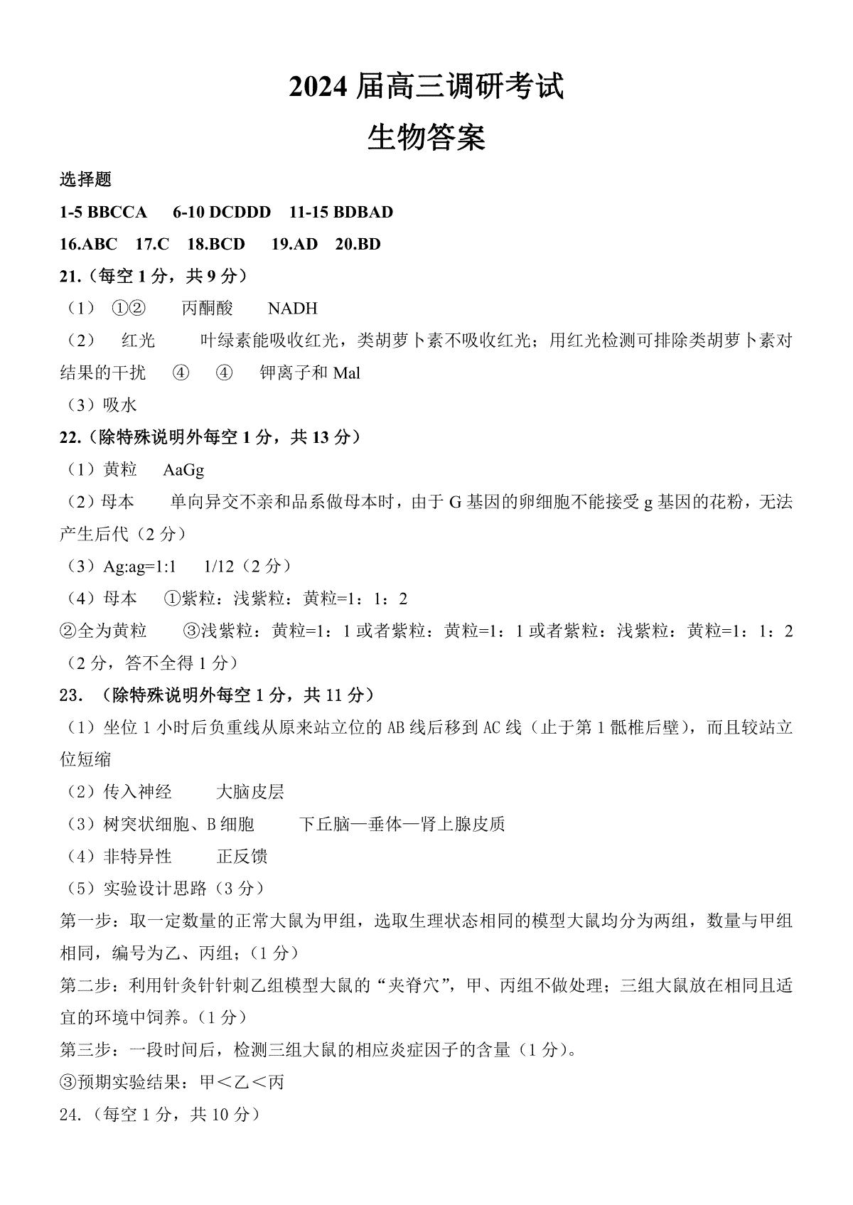一、山东省实验中学2024届高三2月调研考试生物答案