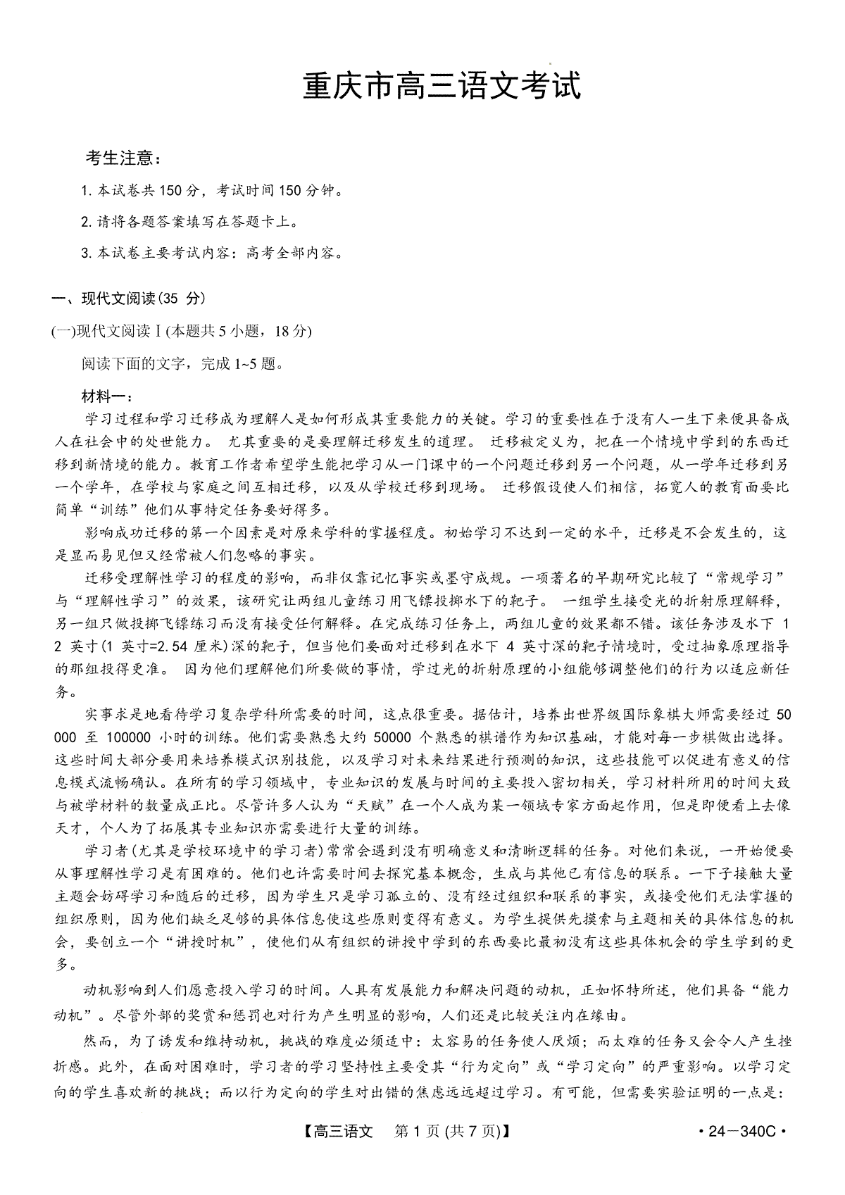 一、重庆好教育联盟金太阳联考2023-2024学年高三下学期3月联考语文试题