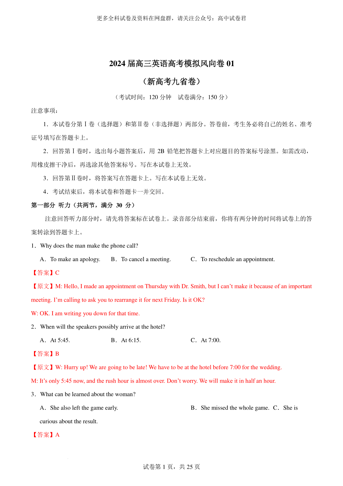 一、(新高考九省卷) 2024届高三英语高考模拟风向卷01解析版