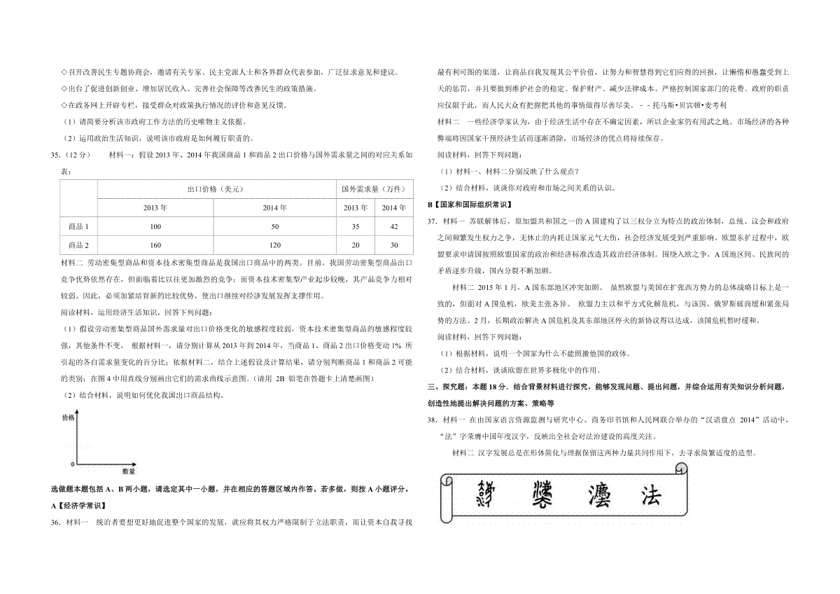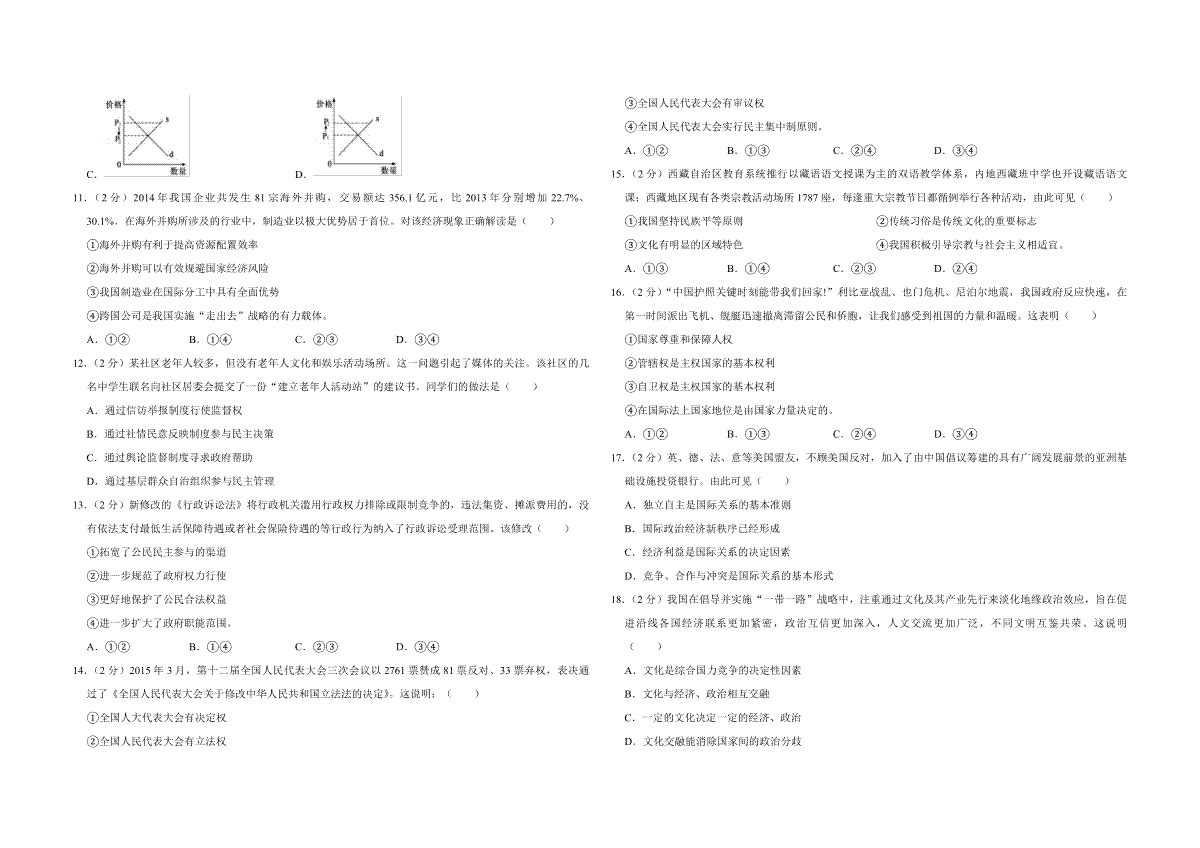 一、2015年江苏省高考政治试卷