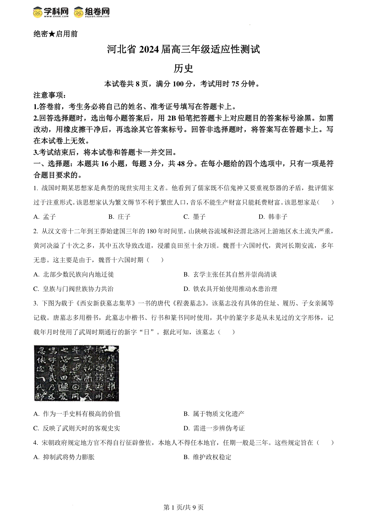 一、2024届河北省高三下学期适应性测试(二模)历史试题