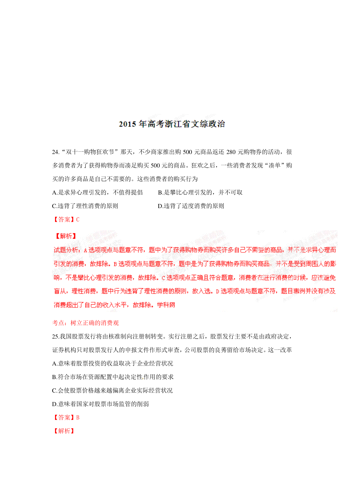 如果你想下载2015年浙江省高考政治【6月】(含解析版)DOC或PDF版,请点击本文末链接!