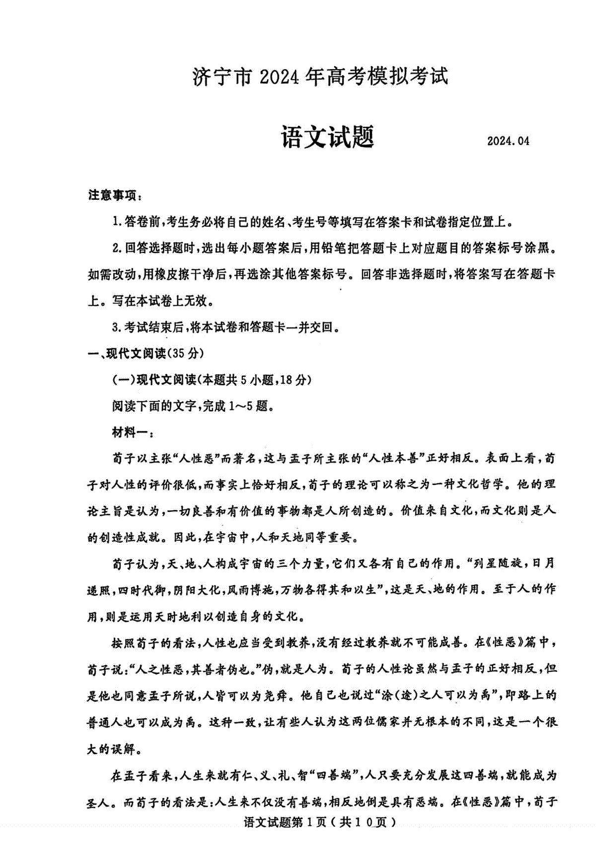 一、2024年山东省济宁二模语文试卷
