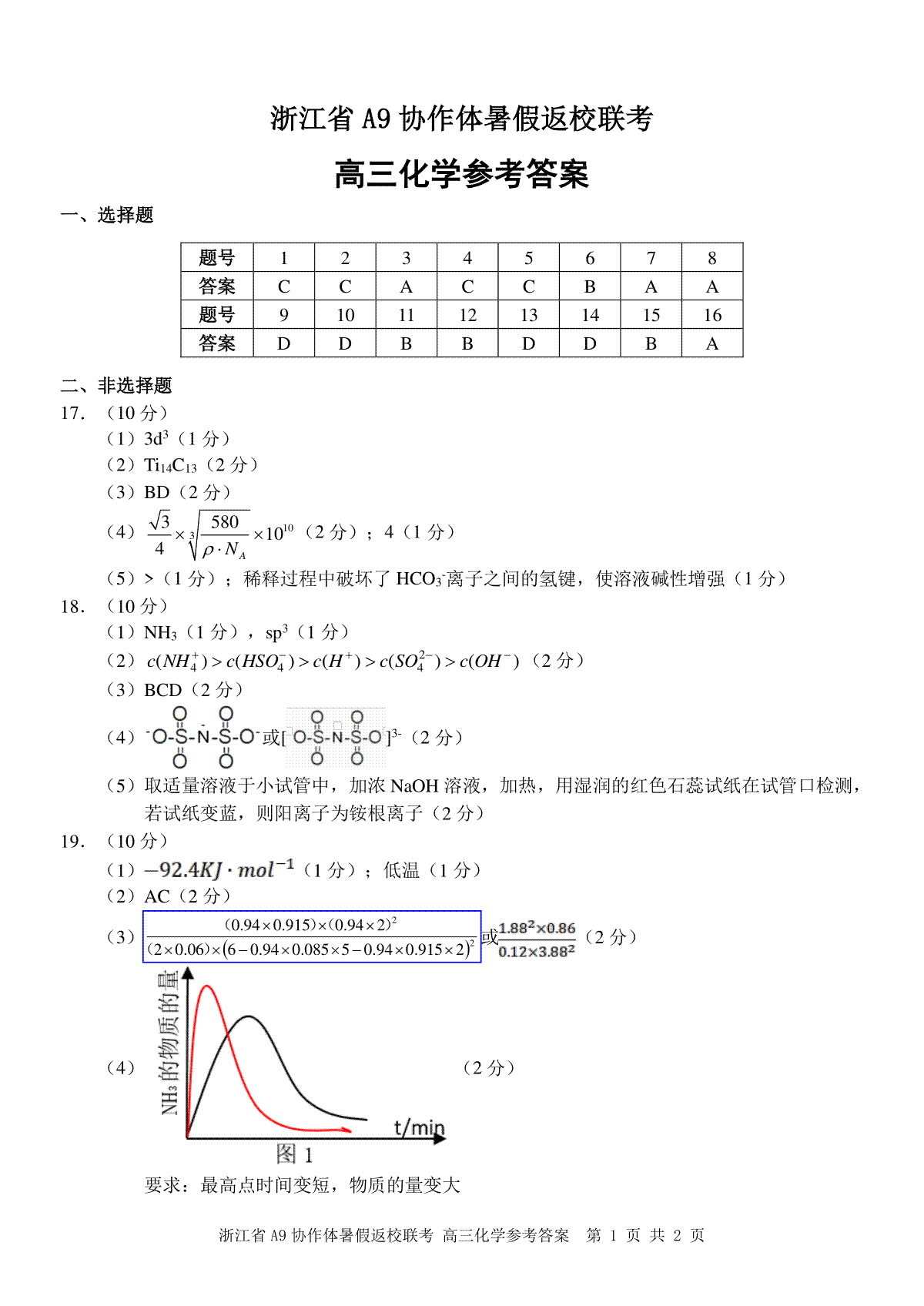 一、浙江省A9协作体2025届2024年8月高三八月暑期返校联考化学试卷答案