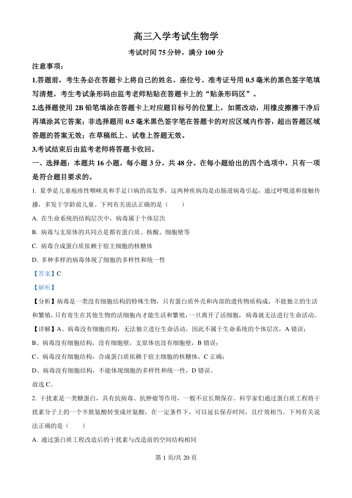 精品解析:四川省成都市蓉城名校2024-2025学年高三上学期入学考试生物试题(解析版)于近期开考,本次考试对考生对知识的掌握参考价值大,为了方便大家复习掌握错题!小编在下文为大家准备了精品解析:四川省成都市蓉城名校2024-2025学年高三上学期入学考试生物试题(解析版)试卷及答案解析详情,仅供考生参考。