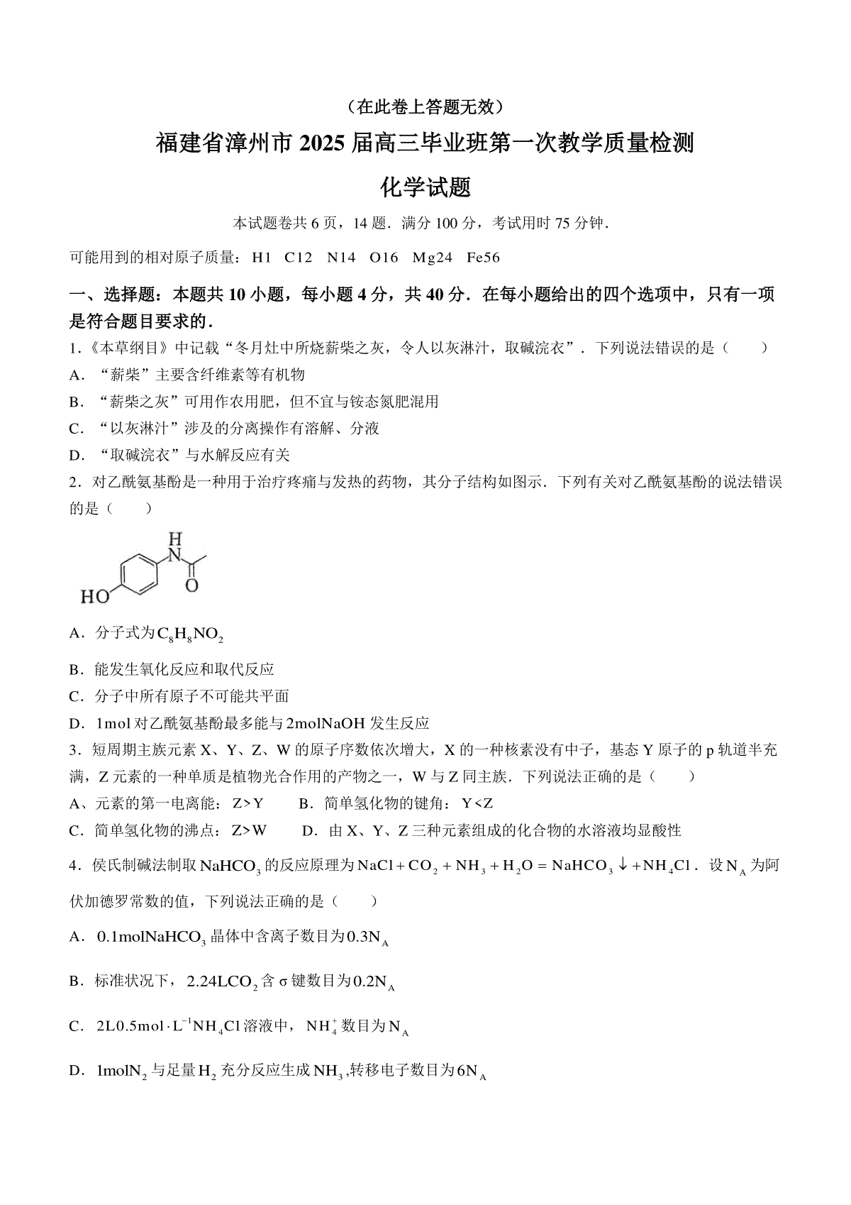 一、福建省漳州市2025届高中毕业版第一次质量检测(漳州一检)化学试题(含答案)
