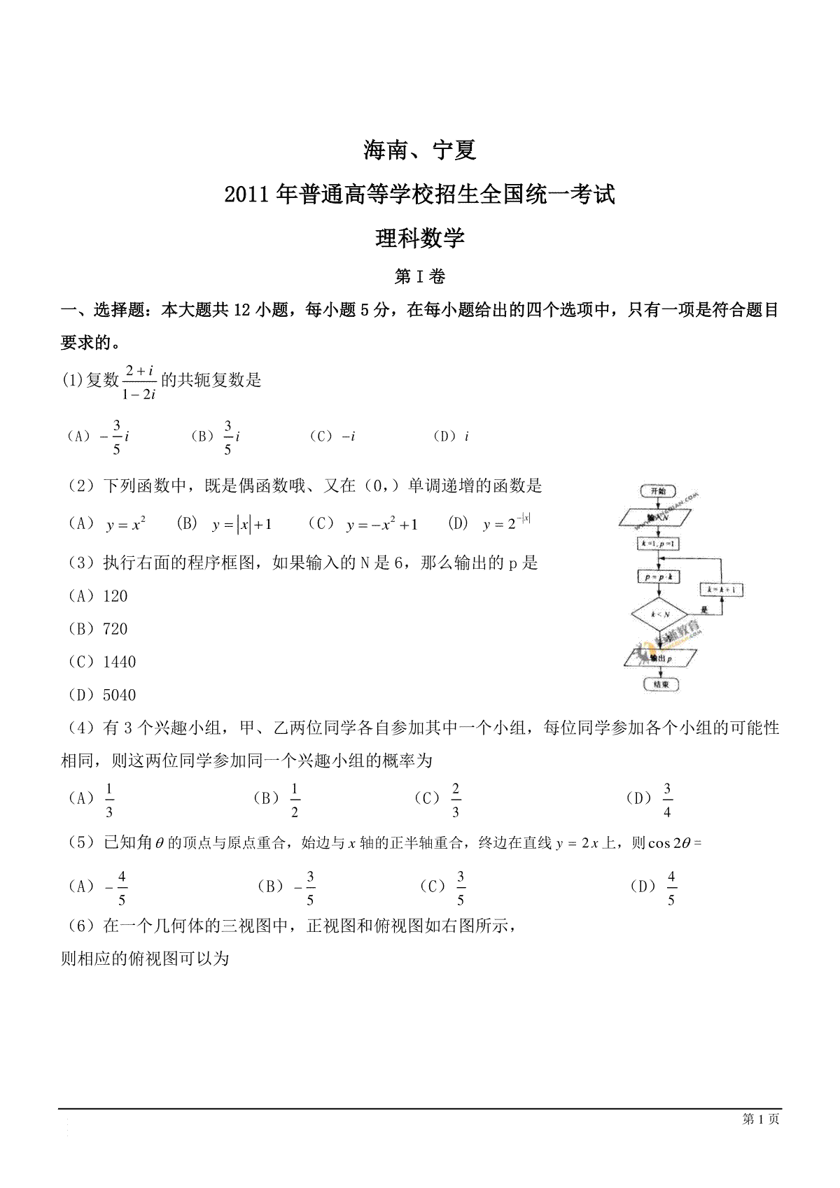 一、2011年海南省高考数学(原卷版)(理科)