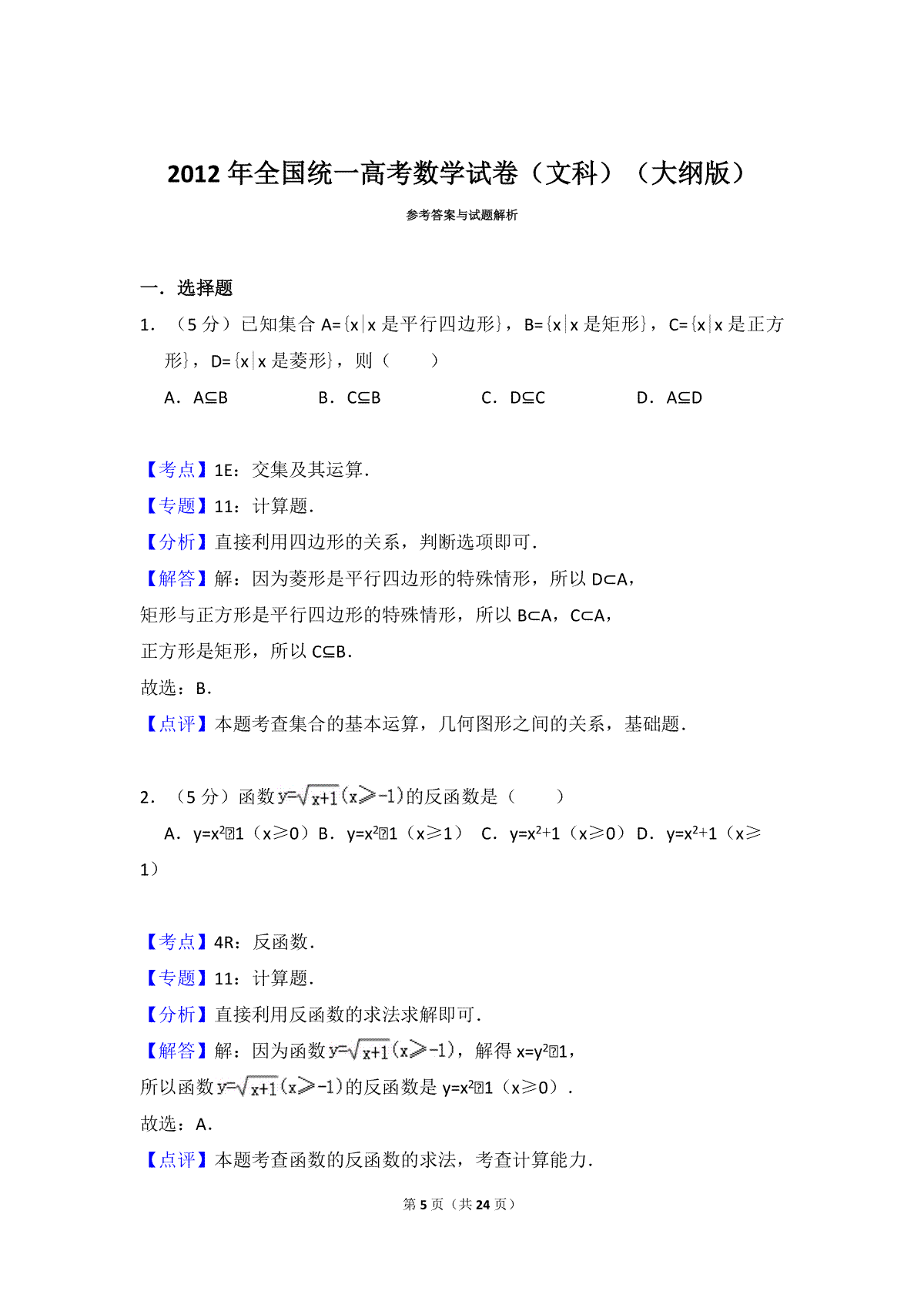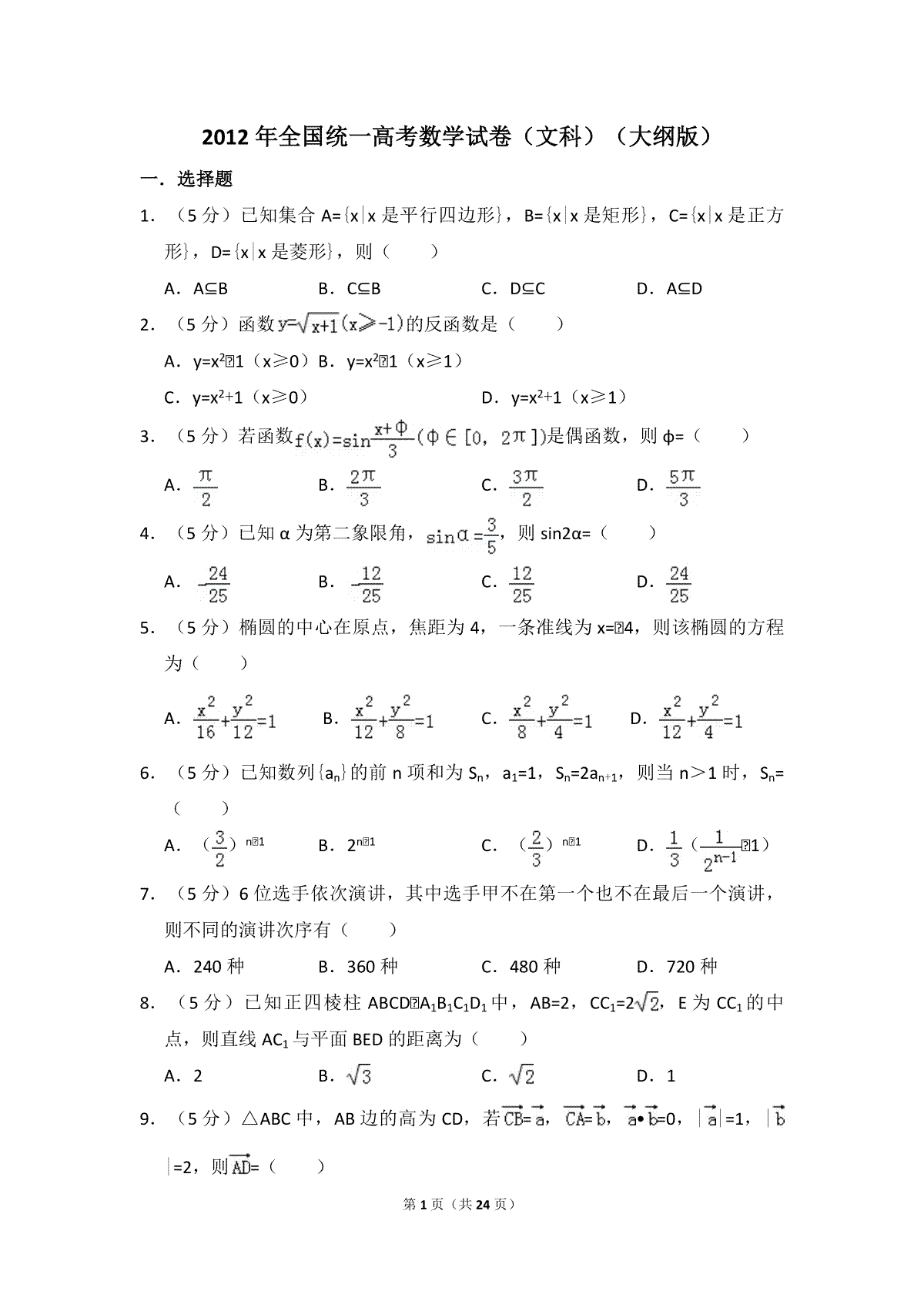 一、2012年全国统一高考数学试卷(文科)(大纲版)(含解析版)