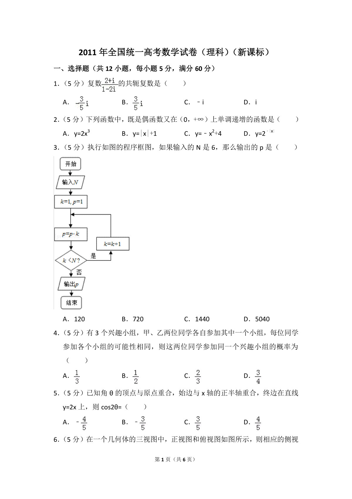 一、2011年全国统一高考数学试卷(理科)(新课标)(原卷版)