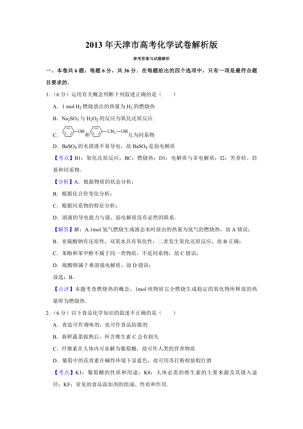 下载2013年天津市高考化学试卷解析版 PDF格式或doc