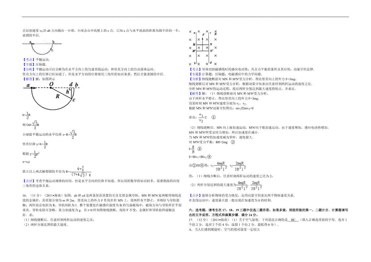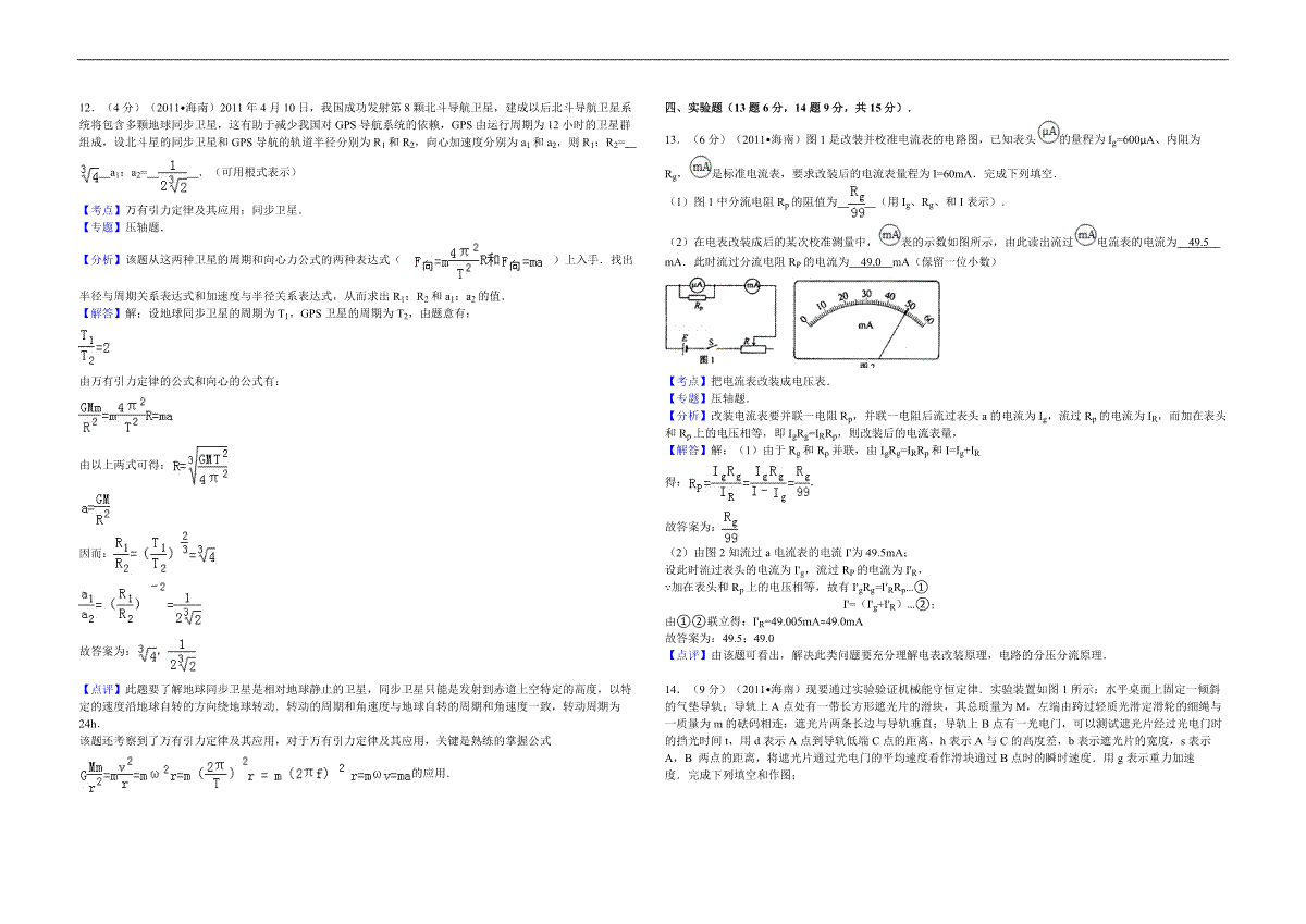 下载2011年海南高考物理试题及答案PDF格式或doc